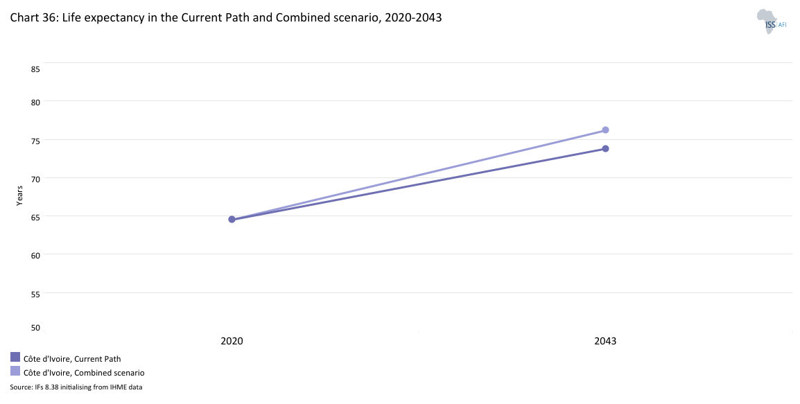 - The Demographics and Health scenario leads to notable improvements in health outcomes in Côte d'Ivoire. Life expectancy is projected to rise to 75.5 years by 2043, up from 73.8 years in the Current Path. Infant mortality declines significantly, dropping from 21.2 to 14.4 deaths per 1 000 live births. Similarly, maternal mortality will fall from 195 to 116.3 deaths per 100 000 live births, highlighting the scenario’s impact on maternal and child health.